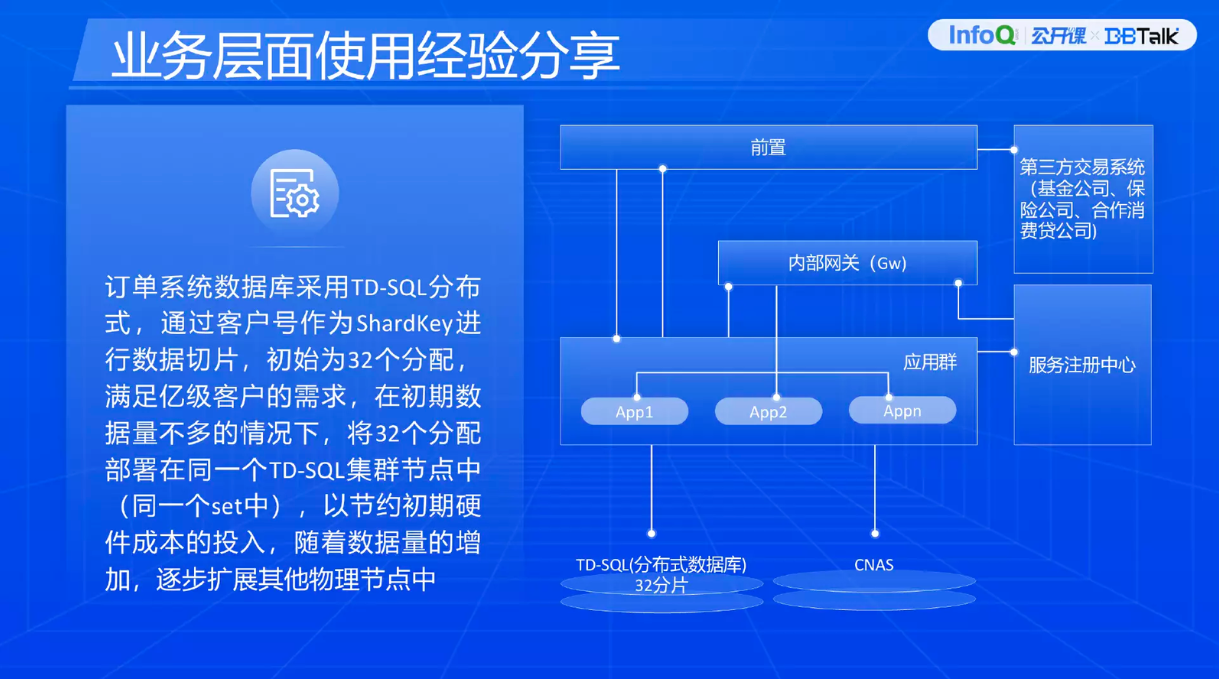 随着互联网业务的开展,数据也出现爆发型增长,所以必须要考虑可扩展性,采用分布式数据库。切记在业务初始规划的时候不要把分片设的太多。我们最初切了 32 个分片,后来降低到 4 个分片。32 个分片给后期的管理、维护带来很大困难,所以根据业务的增长应该是逐步扩容,不能一下子规划得太大。
