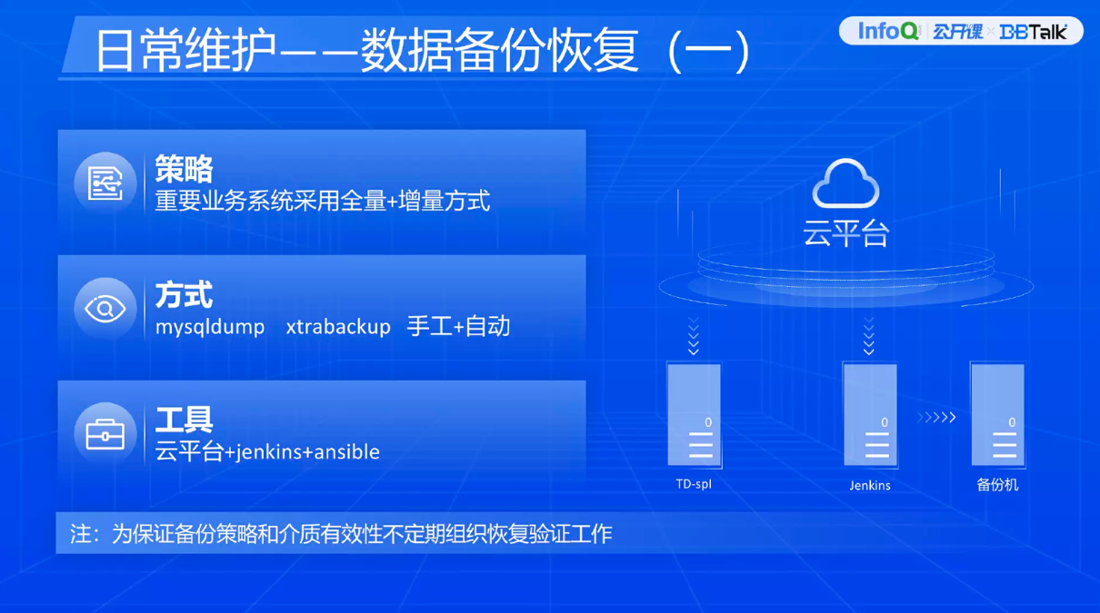 下面围绕架构里日常典型的几个操作展开。首先分享一下数据备份恢复。为了保障金融机构系统稳健运行与业务连续性,以及对金融机构关键业务 RTO、RPO 的要求约束,数据备份恢复工作是非常重要的日常工作。我们目前使用的备份策略就是全量+增量备份。因为每一个全量备份的成本很高,所以目前用比较灵活的全量+增量的方式。备份的方式包括逻辑备份+冷备份,以及手工+自动备份。工具目前用的是腾讯云平台+自动化工具配合使用。右侧是一个简单的样例图,最左侧是靠平台做数据的备份,备份完了之后把温数据通过自动化工具再拉取到目标机器,做冷出、介质转存等操作。因为这个平台是在一个数据中心,再往右侧的过程是拿到同城的另外一个数据中心去。为什么叫温数据?为了预防后续可能出现紧急问题,考虑数据紧急恢复要求,我们不可能把所有数据一备份下来都拿到另外一个地方转存,同时这也考虑了备份成本。为了保障备份策略及时有效性,我们也会不定期做数据备份恢复验证的工作。