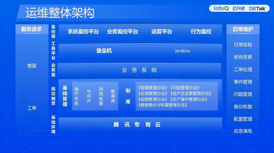 左侧是客服与工单。运维靠这两个渠道去推动日常工作,比如说客户发现无法开展交易,通过客服渠道以工单的形式提到运维里。右侧是日常运维主要工作内容。