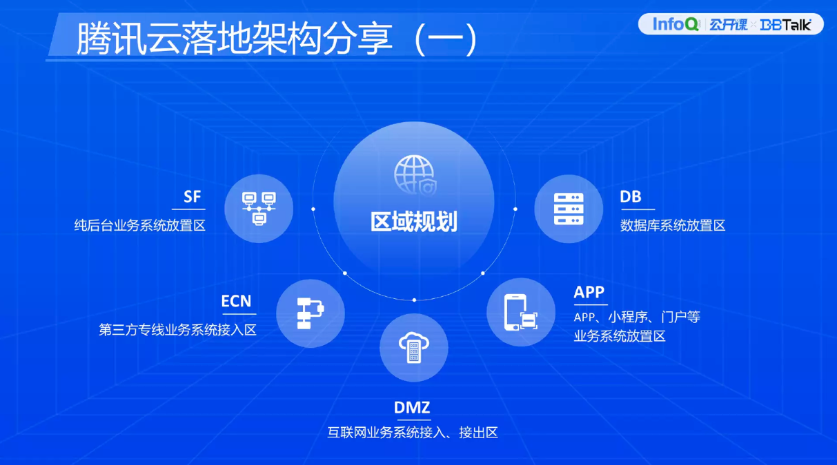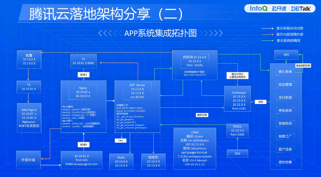 上图就是典型的业务系统在腾讯云架构的部署方案。绿色箭头就是内部系统的通信,我们架构是微服务分布式架构,最右侧是后端的一些系统,通过 Zookeeper 注册到这里。还有内网关设置权限的管理,权限管理就是不同的交易码之间的访问关系,要设置是否进行访问。还有对交易流量进行限流管控等。APP 怎么外调第三方?比如说 APP 系统主动调反欺诈功能,以及友盟的数据。首先 APP 数据出来之后,通过 F5 负载,通过 Nginx URL 出去了,然后到了第三方外调。外部业务系统怎么进来呢?通过外部的客户、用户,通过域名,到互联网 F5,再到 Nginx,Nginx 通过 Local 定位服务。