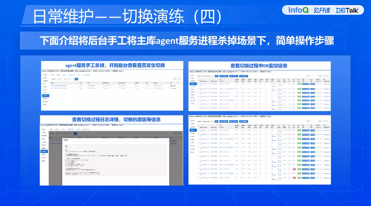 上面是当初操作过程中的截图。我们分了两个租户,一个是生产租户,一个是测试租户。杀掉服务之后,看看是否能发生切换。把主库的 agent 杀掉之后,左上角第一个图显示的是什么时间点主库发生异常,第二、第三个图,都是一些详细的告警信息。它会展示哪个数据库发生了切换,以及相应的告警信息,还有一些详细的日志,写了为什么发生了切换,什么事件导致切换的过程,日志会打印出来详情。第四个图展示的是切换完成之后,主库 IP 地址变成备库,备库的 IP 地址变成主库。