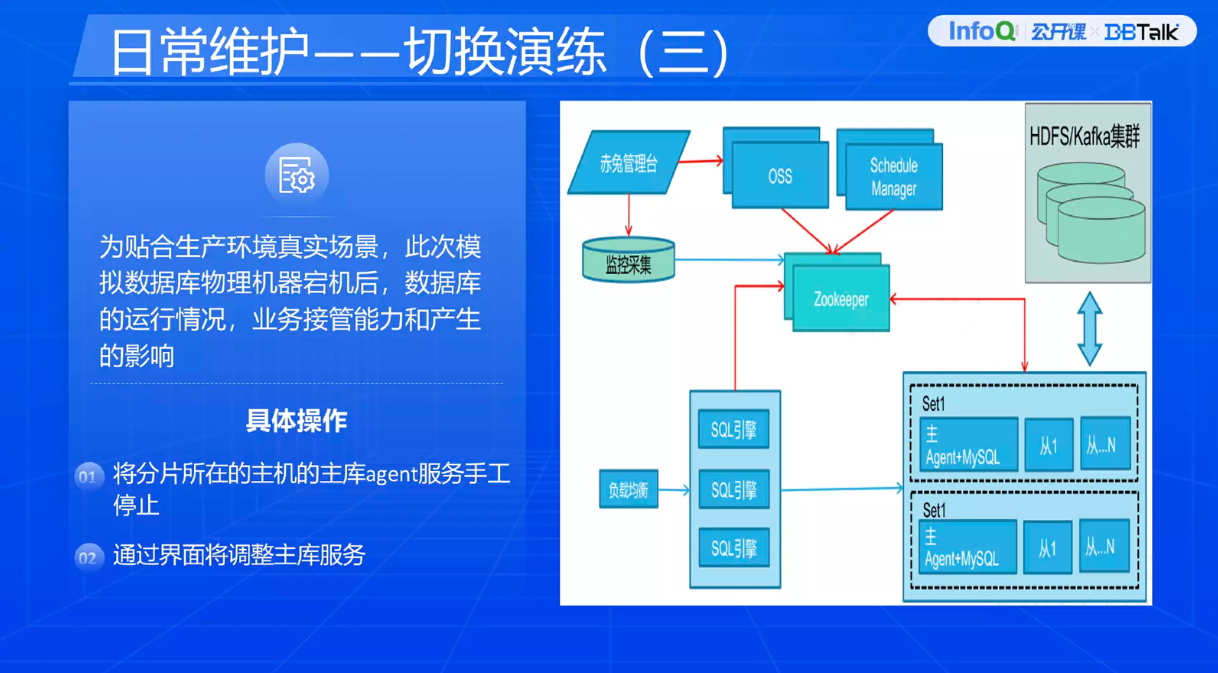 上面的演练是为了贴合真实生产环境场景的案例。这里模拟分布式数据库一台主机异常宕机之后,数据库是否可以对外提供服务能力,以及业务能否继续运行、交易能否正常响应。当时做了两项操作,模拟 agent 主库宕机,看看能不能监管,以及如何进行操作。