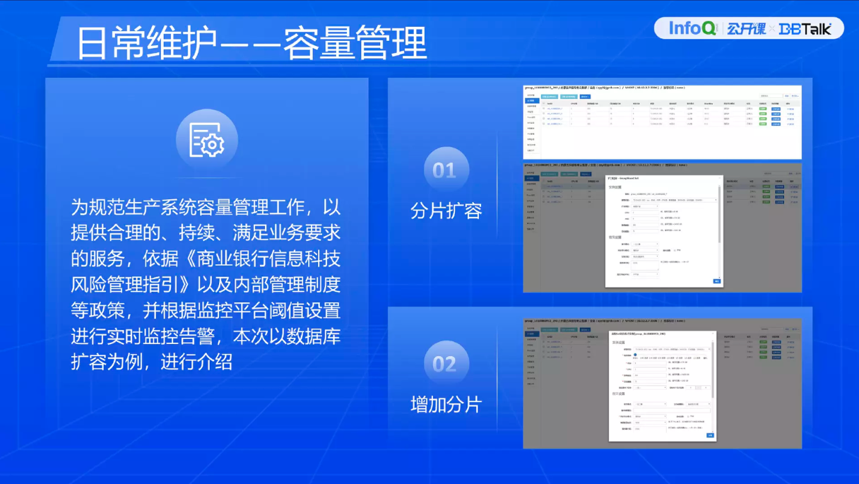 第一,大并发与高可用。因为面向的是互联网的业务,在技术架构上一定要考虑 7*24 小时不间断业务与交易峰值的场景。第二是易于维护与管理。因为在选型落地时要考虑农商银行普遍存在的 IT 基础薄弱、人力资源有限的问题,所以一定要选操作简单、学习成本比较低的平台。第三,采用分布式存储。分布式存储指的是金融机构传统业务大部分使用的是集中式存储,成本高、管理难度大、技术要求也较高,所以为了解决这些困难,我们一定要采用分布式存储来落地未来业务平台。技术选型的前瞻性、架构的合理性也是当初重点考虑的内容。