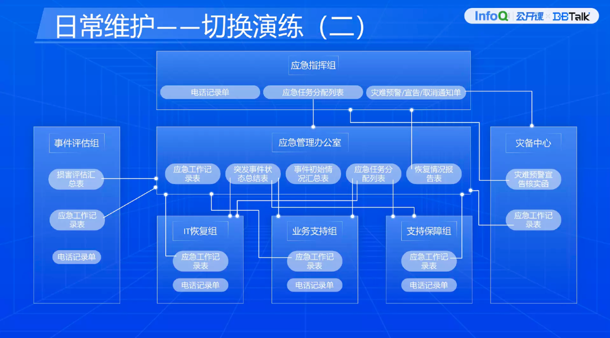为了更好地开展应急演练的工作,要有相应的组织架构职能。应急指挥组一般都是高级领导担任,负责应急预案的启动以及对外宣传。口径要统一管理,不能随意发布公告、信息。应急管理办公室负责上传下达,收集各小组的情况,还有日常的汇报。技术支持组是三方或者远场保障人员。还有应急实施组,做应急事件的评估、响应等工作。业务支持组做业务的验证,包括业务的可用性,是否可以对外营业等。还有支持保障组做一些后勤保障,保障出现应急之后的场地、财力、物力、人力。