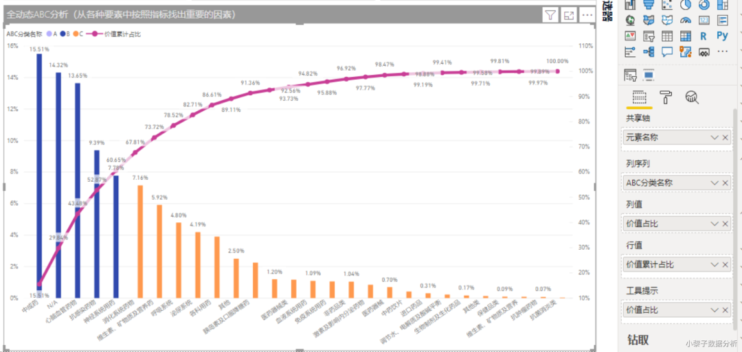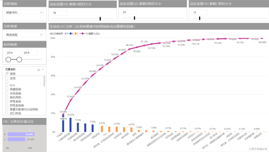 商品档案维度:商品类型、商品一级分类、商品二级分类、剂型、生产厂商、主治功能 销售指标:销售笔数、销售成本、销售金额、销售毛利 动态设置ABC参数 ABC元素价值指标处理