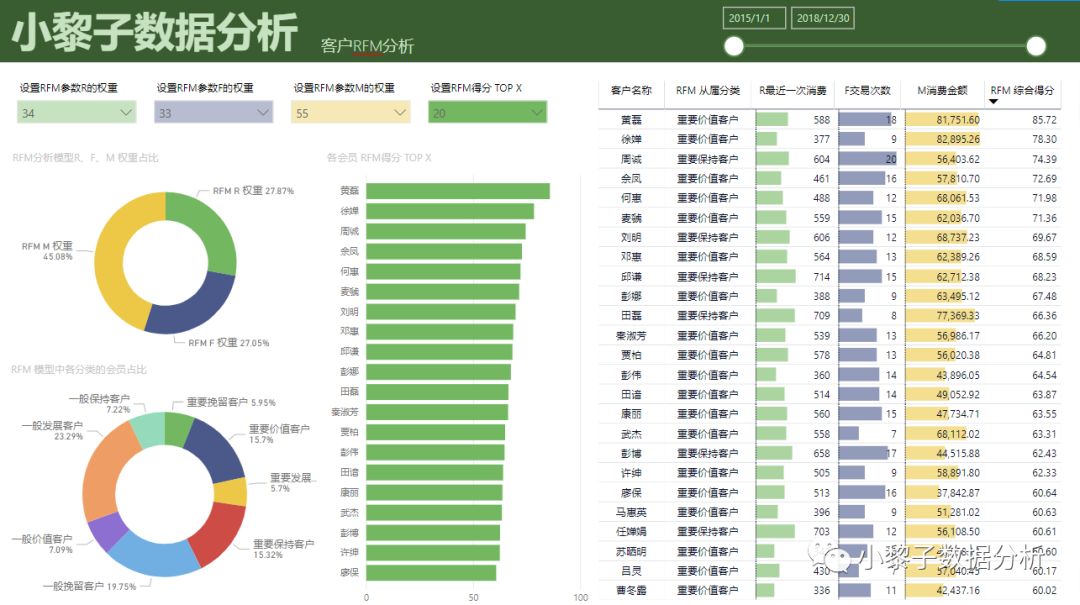 切片器拖放辅助表中的权重R\F\M字段和TopX字段,并设置显示格式为下拉。日期切片器直接设置开启滑块