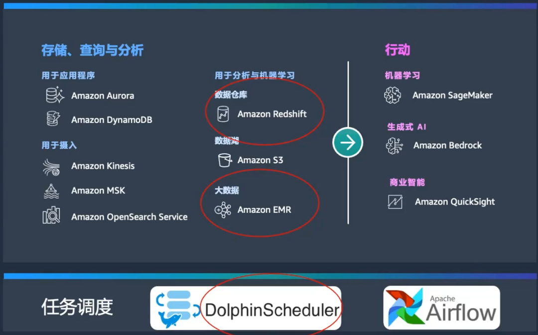 Redshift:用于数据仓库的解决方案。 EMR:Hadoop生态圈的大数据处理组件。 DolphinScheduler:任务调度工具。