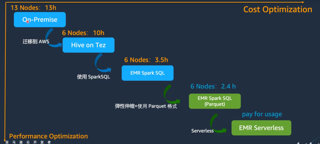 客户实现了集群版EMR与EMR Serverless的混合使用,将部分工作负载迁移到EMR Serverless上,达到了极致的性价比,性能优化在很大程度上也代表了成本优化。
