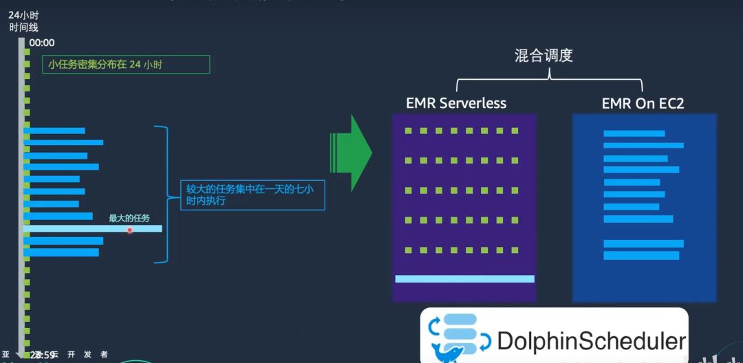 通过Apache DolphinScheduler,客户将工作负载分别调度到EMR On EC2和EMR Serverless上。