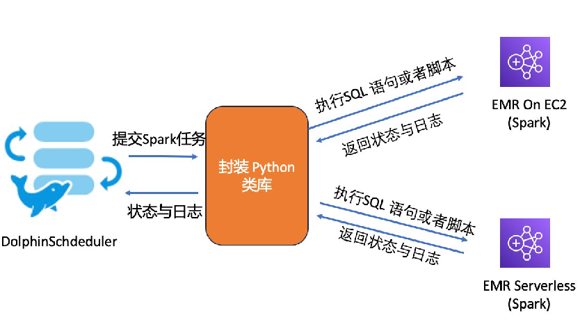 我们和客户一起封装了一个Python类库,通过这个类库,统一了EMR On EC2和EMR Serverless的任务提交、日志查询和状态查询接口。在DolphinScheduler中,客户可以通过统一的API无缝地的在EMR Serverless 和 EMR on EC2 之间切换工作负载。