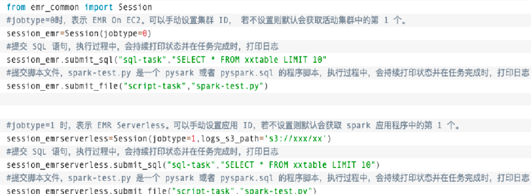from emr_common import Sessionsession_emr = Session(job_type=0)session_emr.submit_sql("job_name","your_sql_query")session_emr.submit_file("job_name","your_pyspark_script")