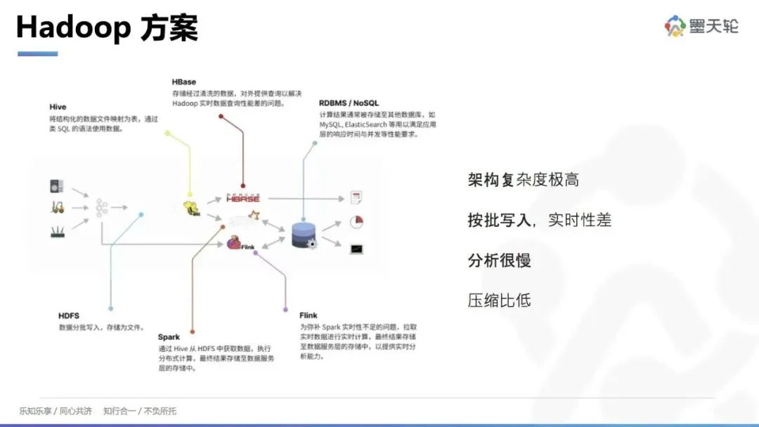这种方案的问题在于架构复杂、数据链路长,每个环节如果出现问题都会影响上下游,变更和调整也会带来很大的影响。此外,Hadoop 方案主要按批次写入,尽管引入 Flink 可以实现实时写入,但整体架构依然复杂,查询性能不佳,数据存储压缩比低。