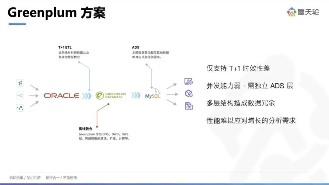 Greenplum 方案的不足在于并发能力较弱,更新和删除操作效率低,需要独立的 ADS 服务来进行数据报告展示。此外,多层架构导致数据冗余,扩容不友好,需要停机,不利于应对大规模数据增长需求。