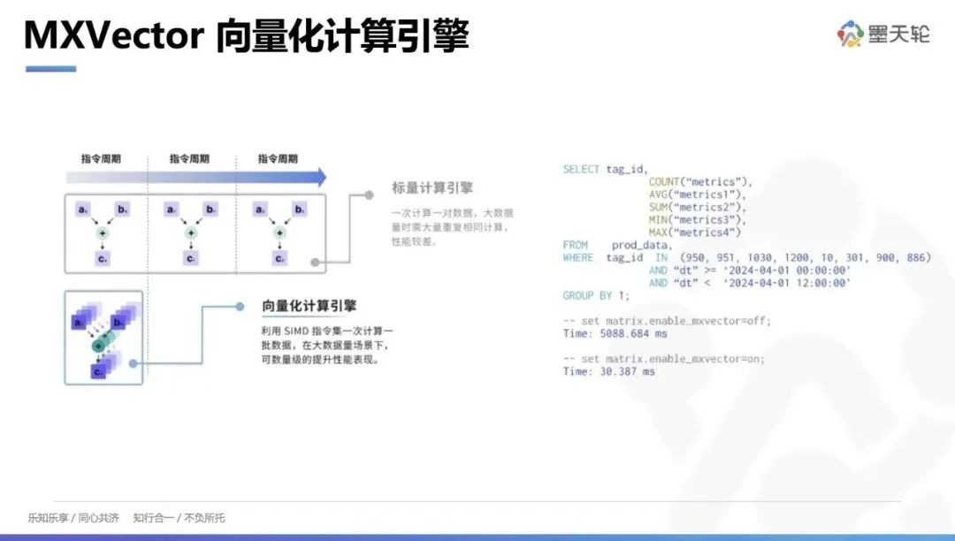 通过引入 MXVector 向量化计算引擎,我们在查询性能优化方面取得了显著成效。对于一个带有复杂条件的查询,关闭向量化时可能需要 5 秒钟完成,但开启向量化后,仅需 30 毫秒即可完成,性能提升效果非常明显。