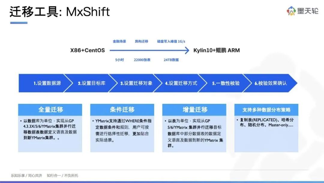 在具体迁移过程中,原架构使用的是 x86+3 通道服务器,迁移到鲲鹏信号体系后,节点数量从 32 台减少到 10 台。整个迁移过程耗时 5 小时,迁移了 2 万多张表和 24TB 据。在分布式写入方面,我们充分利用了系统性能,达到了满负载写入。此外,我们还支持条件筛选、数据分布策略调整、数据一致性校验以及结果确认。此次迁移显著提升了系统的性能和稳定性,为金融行业提供了可靠的数据处理解决方案。如果大家 YMatrix产品感兴趣,欢迎添加小助手。