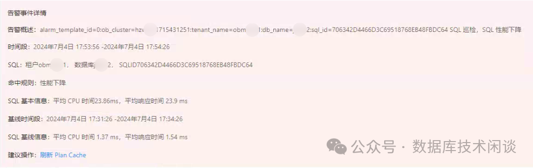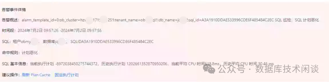 当然如何从大量 SQL 里快速发现执行性能偏离基线的异常 SQL,这个就是 OCP 的能力了。推测用到一些机器学习的技术。如果没有 OCP 我还不一定能很好的展示这个。首先 OCP 的告警里会给出 SQL巡检告警规则,有两个子类:性能下降、(执行)计划恶化。这是两个视角。前者是说某类 SQL 性能下降了。其原因可能是执行计划变了,也可能是执行计划没变但是是数据变了。后者就是明确发现执行计划变了。这两类在实际情况下都存在。