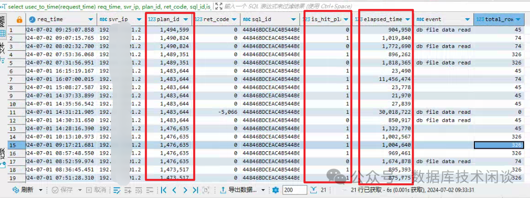 select usec_to_time(request_time) req_time, svr_ip, plan_id, ret_code, sql_id,is_hit_plan, elapsed_time, event ,return_rows + affected_rows total_rows
