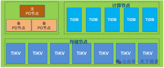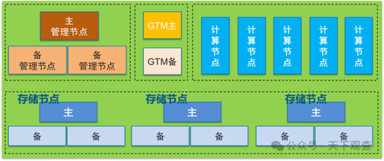 其部署结构由管理节点(元数据管理)+GTM(全局事务管理)+计算节点+存储节点组成。