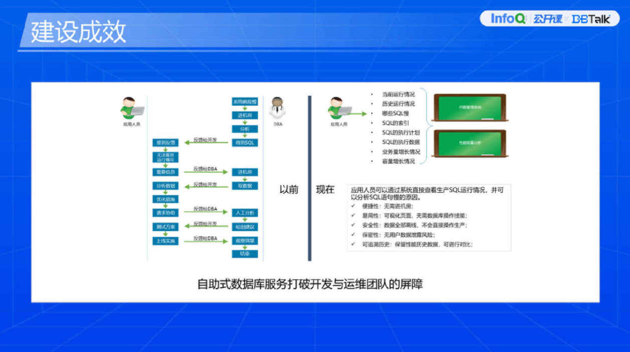 比如说抓一些 TOP SQL,其他部门人员可以自己到平台上做,做一些简单分析可以自助完成,不用找 DBA。应用人员可以完成从问题的发现到一定程度的优化处理过程,再到最终上线也可以自助完成,DBA 只要在一些关键节点上介入,做一些流程化管控,就可以很好地保证数据库运维及使用上的安全性,效果非常显著。DBA 每周在数据库风险定位上花一些时间,把相应工作安排下去,对现有数据库做优化和提前风险处理,相应的关键节点让 DBA 介入,做一些管控。所以系统落地之后成果显著,这其实也是我们建设数据库自动化运维体系时,每个客户最终都想要达到的效果。