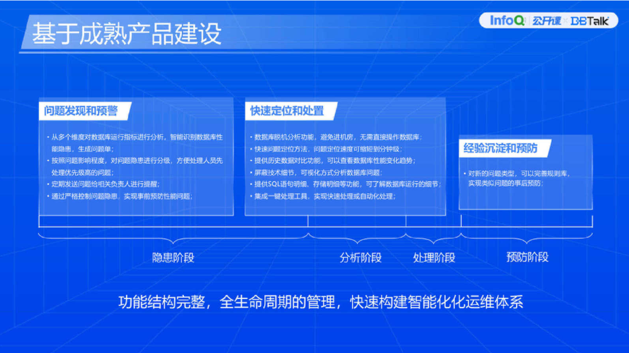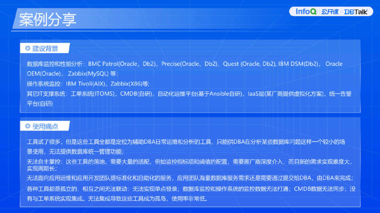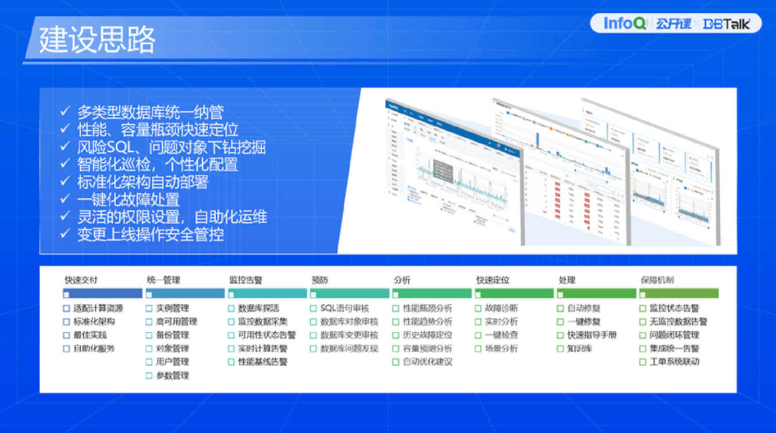 第三是长期演化。需要明确,建设这样的平台并不是一蹴而就的,不是今天买了这个产品装上之后,整个运维体系就好了。它并不是这样,它要结合自主可控、定制化研发,去满足各种各样的场景需求,和 IT 对接,后期逐步完善一些更高级的功能。比如说前期建设了统一纳管平台,实现了基础的监控、巡检能力。后期我们考量逐步增加一些运维操作,甚至结合监控、告警及运维操作实现自愈能力,包括把 DBA 的能力通过平台输出去,而不是说只有 DBA 去使用,让开发、测试部门也能够借助这个平台做一些事情,从而提升整体的运维效率,这些事情都是一步一步地去做的。为什么要有定制化调整?因为每个细节都影响着实际落地效果。所以建设的时候要深度考量前期最主要的痛点是什么,后期准备往哪些方面发展。