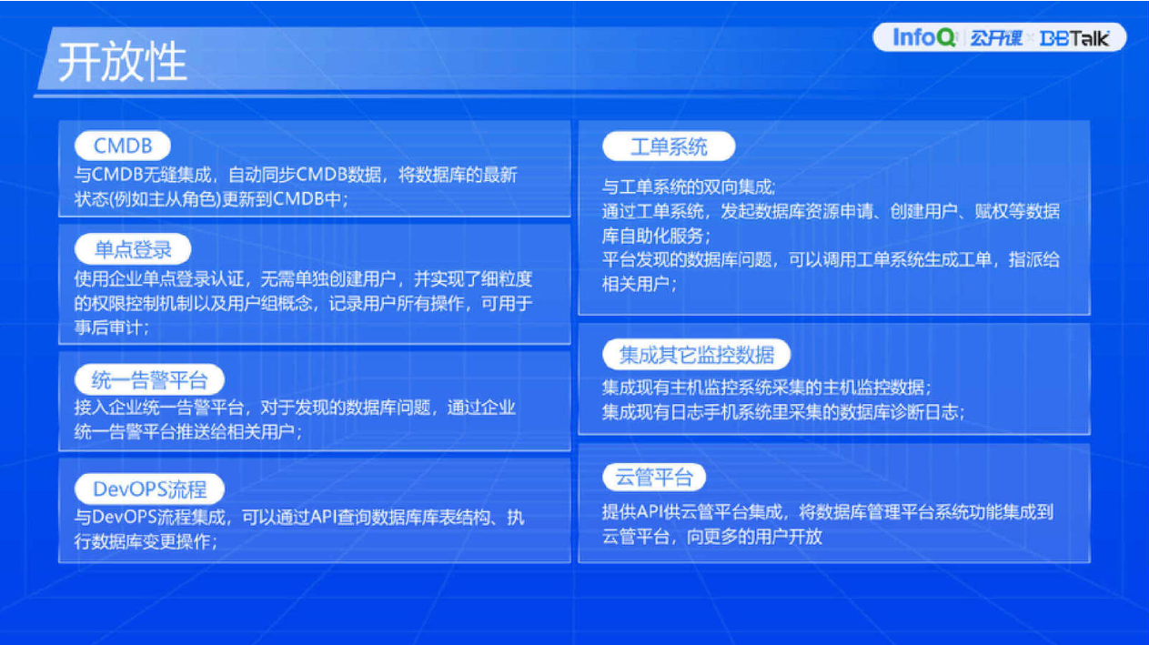 第四是可扩展性。可扩展能力对平台也非常重要,架构、功能上都需要有可扩展能力。比如现在有一百多套库在用,一两年内增长到几千套的规模都有可能,需要平台具备相应的可扩展能力。另外数据库运维非常复杂多变,针对不同的运维场景,一些特殊问题产生的时候系统能不能提供很好的技术手段,帮助我们快速定位风险和问题、解决故障,这也考验平台的功能扩展能力。