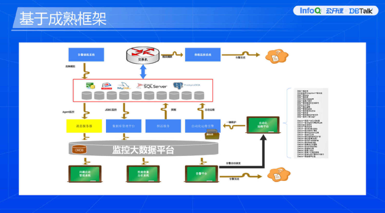 第二个是借助优秀产品框架去建设统一管理平台,它的特点在于能够发挥企业现有的 IT 能力。企业内部 IT 建设并不是从零开始,之前一般会陆续建设很多系统,大部分客户不是非必须的情况下并不会把现有系统直接替换掉,还是希望充分发挥它的能力。运维人员做运维流程的时候,也会看到它中间有一些关联性,各个系统之间很难关联起来。这个建设思路就是基于成熟的框架,在企业内部快速搭建数据库自动化、智能化运维体系,把现有的 IT 资产很好地串联起来。比如我们以前有告警系统,也有一些简单的监控,我们以前是产生一些告警后看一下问题如何处理,然后又有一些运维平台触发运维动作,各个系统是独立的,没有办法很好地串联起来,内部一些流程化的管控都比较困难,基本都靠人。现在有了成熟框架嵌入进去,就可以充分发挥内部效率。另外,这个系统在建设的时候需要我们投入较大的精力去思考,建设平台的时候要跟哪些系统做日常对接,才能让整个体系通过对接和集成快速搭建起来。如果我们前期没有考量完善,它会影响后期建设的效果。