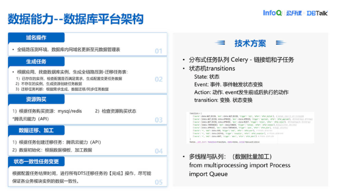 比如说我们要对域名操作,要生成一个任务表,基于任务表做资源的购买创建、状态的查询。资源已经存在的情况下,我们要做数据迁移的任务,同时还要做数据初始化工作,这些任务完成之后还要保证数据的一致性。这边是通过 DTS 迁移任务,通过异步的瞬间完成,把 DTS 任务终止掉,保证数据的一致性。一般情况下我们 200 多套实例,基本上可以在 1 分钟之内全部完成。这个数据的差异可能在 1 分钟之内,也就是秒级别的,通常情况下秒级别的数据可以完全满足压测数据一致性要求。