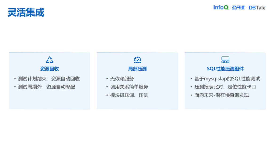灵活集成里比较有亮点的一个组件是 SQL 性能压测组件。这也是线上的一个组件,集成这个组件的目的是为了定位性能的卡口。比如我们在压测业务接口的时候,发现业务接口压不起来,我们可以把业务对应的 SQL 语句通过压测组件做 SQL 级别的性能压测,来比对 SQL 的 QBS 和接口 QBS 的差异。同时基于这种接口在压测环境做一些 SQL 的性能压测,可以发现一些潜在的慢查询。