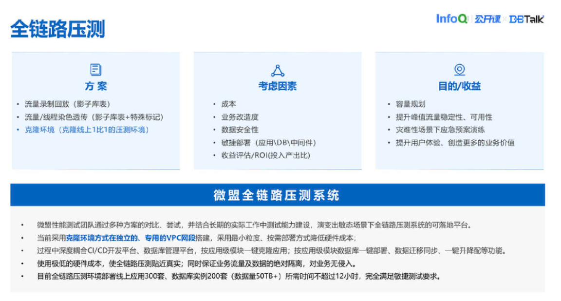 以上是微盟全链路压测系统的方案、考虑因素和收益介绍。微盟要解决一些真实性问题,比如说业务侵入性问题,数据隔离问题。所以微盟的性能测试团队通过多种方案的对比尝试,并结合长期实际工作中的测试能力建设,演变出敏态业务场景下全链路压测的可落地平台。当前我们采用的是克隆环境的方式,它是在传统的压测基础上做了一些敏捷性的改造来实现的一套系统。这种克隆的方式是在一个独立的专用 ABC 网段搭建出来的,跟线上完全隔离,业务也不需要任何改造,数据也能够保持真实性。