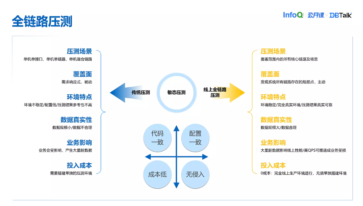 对比传统压测和线上全链路压测,传统压测的好处是业务影响非常低,环境非常独立,投入的成本是可控的。线上的全链路压测有很多实现方式,可能会影响业务,数据比传统压测更真实,覆盖面非常广。