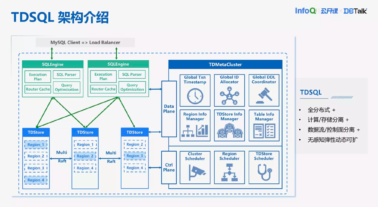 TDSQL 是全分布式,存算分离的数据库,由三个模块构成。最上面是 SQLEngine,是一个计算节点,它的目的是将 SQL 语句转化为 KV 请求,然后发送给存储集群。它会做一些查询优化和 onlineDBL 的功能。下面是 TDStore,是存储的一个分布式集群。然后它是一个 KV 的存储模块,用来接收 KV 请求。TDStore 做了数据分片,把整个范围的数据划分成各个连续的 Region,每一个 Region 是一个独立的 Raft,Raft 中每一个副本打散在不同的 TDStore 上,这样就实现了比较初步的负载均衡。