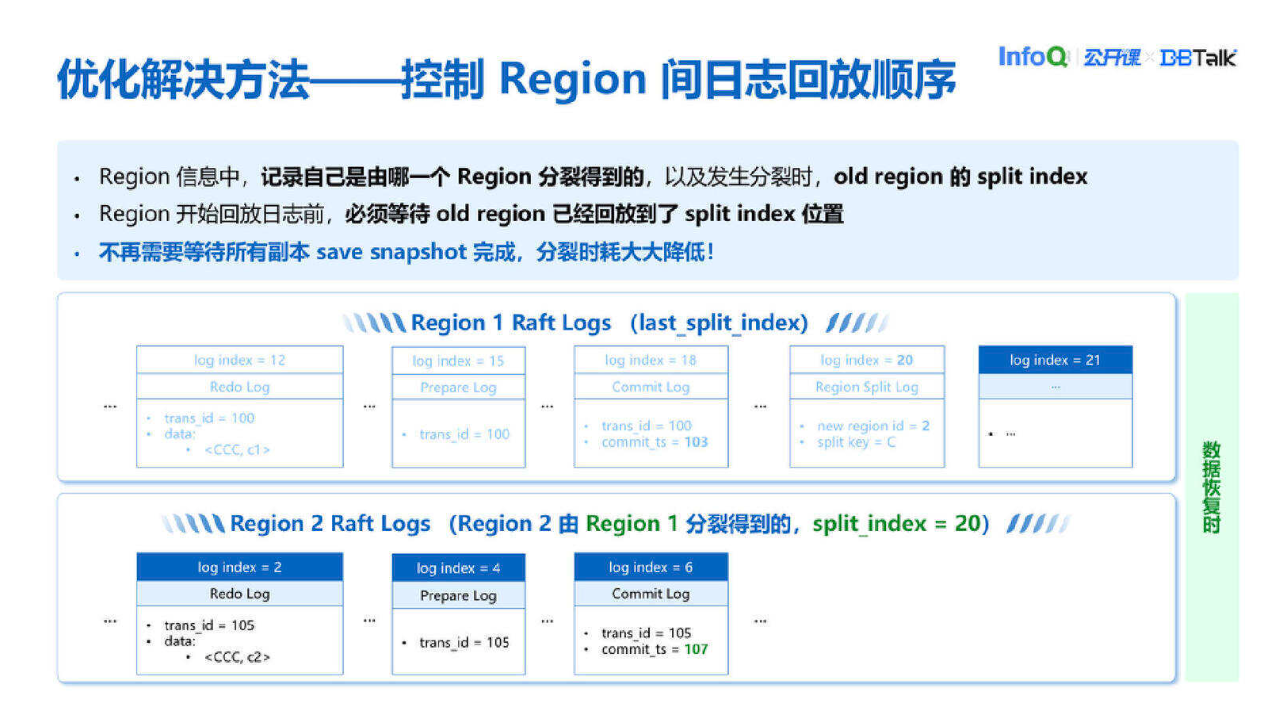 比如说我们会在 Region2 上新分裂出来的 Region 信息上记,它是由 Region1 分裂得到的,并且发生分裂的时候 Region1 上面的最新的 Region Raft Log 是 20。所以数据恢复的时候首先我们会等这个 Region1,它要先回放到 20 这个位置,之后我们再去允许 Region1 后面的日志 Region2 的日志并发回放。通过这种机制我们就保证了事务对于单条 Key 的写入顺序和恢复顺序二者保持一致。这个相比之前同步等待 Save Snapshot 的方案,分裂的时候不再需要去等日志回放比较落后的 Region 副本去回放到 20 这个位置,分裂速度大大提高了。