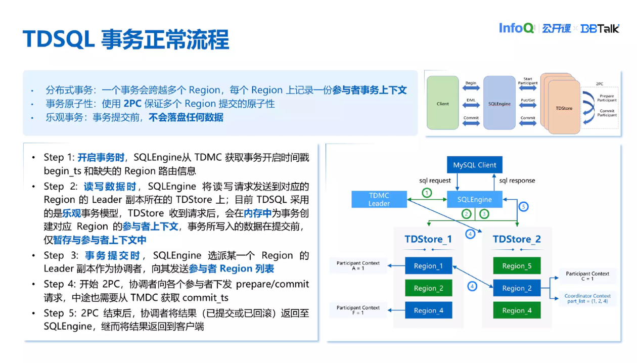 同时 TDSQL 也保证了数据正确性,数据完整性保证是在参与者上下文当中记录分裂出来的 New Region ID,把 New Region ID 上报给协调者,这样协调者可以感知到 New Region 的存在,把 New Region 一起提交上去。