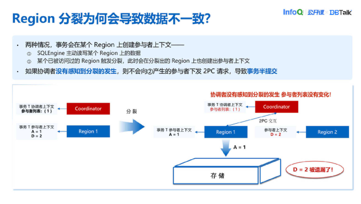 这里举个例子,用户 A 想向用户 D 转账 10 块钱,可能分裂之前 Region1 其实是存储了两部分数据,分别是 A 少了 10 块钱跟 D 多了 10 块钱。但是当分裂发生之后 A 少了 10 块钱是属于 Region1 的,而 D 多了 10 块钱是属于 Region2 的,这两部分数据是分摊到了两个 Region 上面。如果说协调者没有感知到这次分裂的发生,就会只向 Region1 下发 2PC 请求,最后提交的时候只有 Region1A 少了 10 块钱的数据,而 D 多了 10 块钱的数据并没有被落盘。因此最终呈现的效果是 A 的余额变成了 90 块钱,D 的余额并没有变,这样算下来 A 跟 D 的金额总数是 190,少了 10 块钱,这样就导致了数据的不一致。