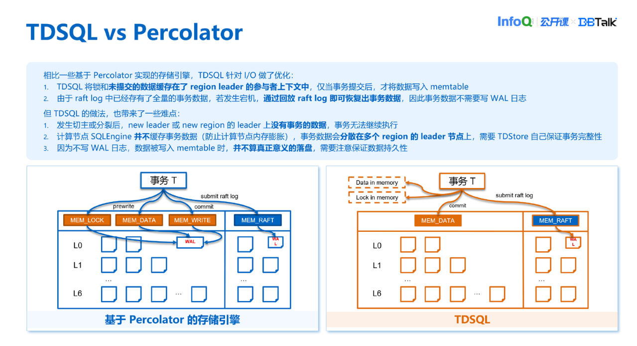 上图是一个事务完整执行的流程图。这个事务流程跟一般的 Percolator 的对比如下: