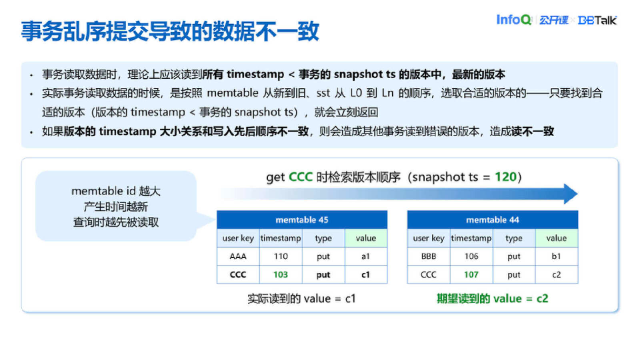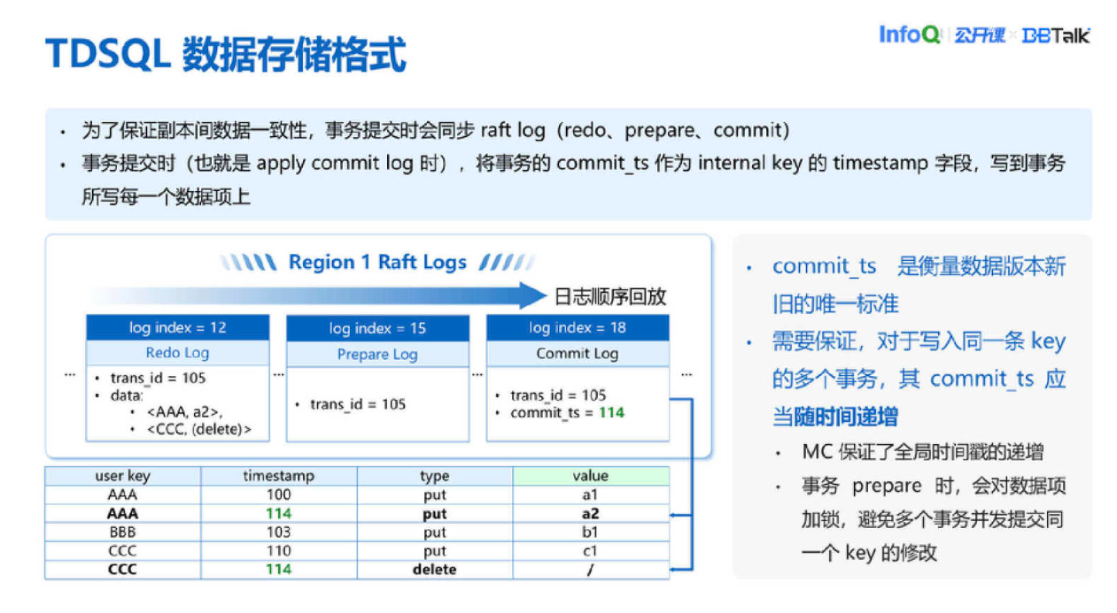 以上是 TDSQL 的数据存储格式。注意 Timestamp 这个时间需要保证,对于写入同一 Key 的多个事务 Timestamp 应该是随时间递增的。目前我们通过两个机制保证这一点。首先是 MC 提供一个全局递增的时间戳,第二是事务 Prepare 的时候会对数据项加一个锁,避免多个数据并发提交同一 Key 的修改。