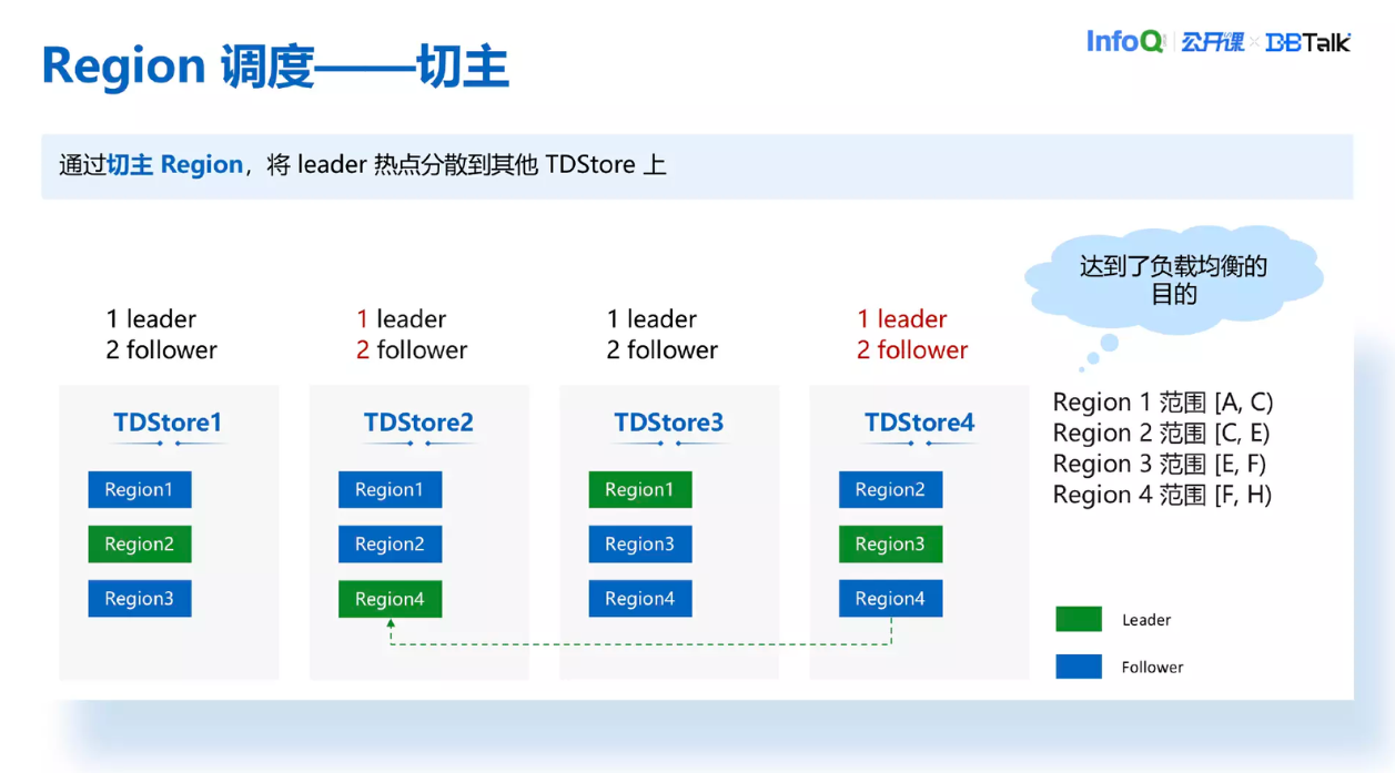 下一步我们通过切主的方式把 TDStore4 的 Leader 切到 TDStore2 上面,这样所有的 TDStore 都变成了有一个 Leader 跟两个 Follower 的压力情况,负载就得到了均衡。