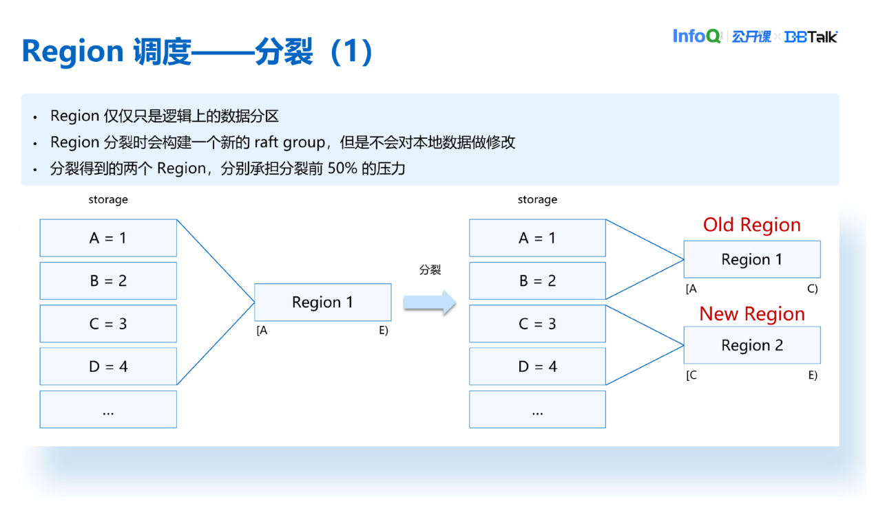 我们看一下 Region 分裂的原理。首先 Region 仅仅是一个逻辑数据分区,比如说一开始 Region1 范围是 A 到 E,包含了 ABCD 四个数据。它经过分裂之后,底层的 ABCD 这四个数据是没有变动的。唯一变动的只是它新增了一个新的 Region2,原来的 Region1 称为 Old Region,新产生的这个 Region 称为 New Region。可以看到 Region1 范围变成了 A 到 C,包含的数据是 A 和 B。Region2 的范围是 C 到 E,管理的数据是 C 跟 D,也就是说经过分裂之后得到的两个 Region 分别承担的是分裂之前的 Region 的 50%的压力。这样可以把压力比较大的 Region 分裂成两个新 Region,压力得到了分担。
