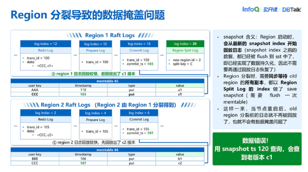 为了解决这个问题,我们引入了 Save Snapshot 机制。它的含义是说,Snapshot 之前这些日志都已经落盘,刷到 SSD 里面了,所以 Region 启动的时候只需要从 Snapshot Index 回放日志就可以恢复出全部数据,没必要从第一条日志开始回放。通过这种机制,只需要在分裂之前以 Region Raft Log20 做一个 Save Snapshot,恢复数据的时候,Region1 只需要回放 20 之后的日志就可以,跟 Region2 就不会有任何交集。这样 Region2 的日志和 Region1 的日志可以并发回放,不会有数据掩盖的问题。