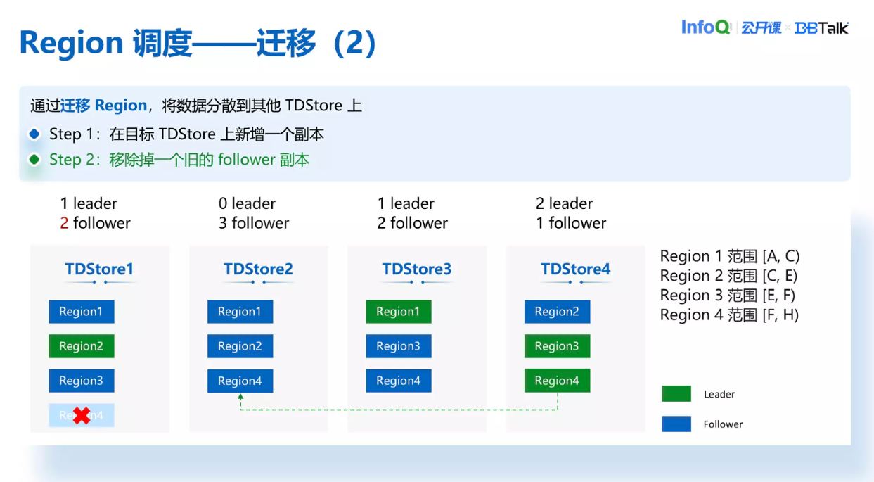 我们通过 Region 迁移去分担一部分 TDStore1 的压力。MC 会向要迁移目标的节点,也就是 TDStore2 添加一个副本任务,然后 TDStore2 收到之后会创建一个 Region4 副本,短时间内 Region4 从 3 副本变成了 4 副本。然后 MC 会向 TDStore1 下发一个销毁副本任务,这样 TDStore1 的 Region4 就销毁掉了,Region4 的副本数又回到了 3 个。这样一套操作下来 TDStore1 变成了一个 Leader 跟两个 Follower,压力会降低很多。