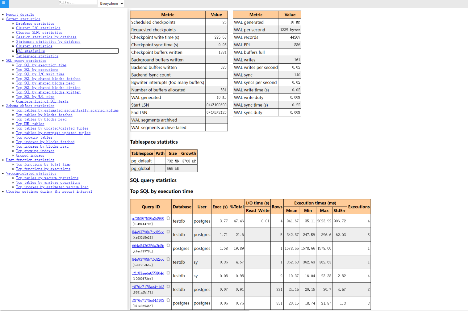 如果您需要报告中的语句统计信息,则服务器连接字符串中提到的数据库必须配置pg_stat_statements扩展。设置pg_stat_statements参数以满足您的需求(请参阅 PostgreSQL 文档): pg_stat_statements.max - 此参数的低设置可能导致在采样之前清除一些语句统计信息。如果您的pg_stat_statements.max似乎太小,报告将警告您。 pg_stat_statements.track = 'top' - 在 Postgres 14 之前,所有值都会影响报告中与语句相关的部分的%Total字段的准确性。