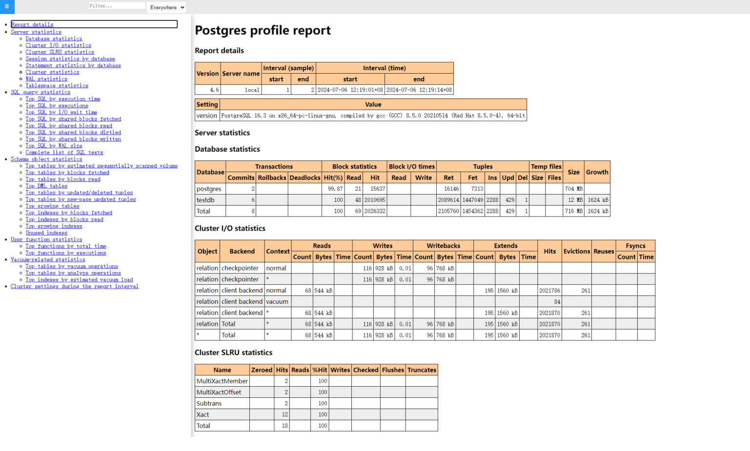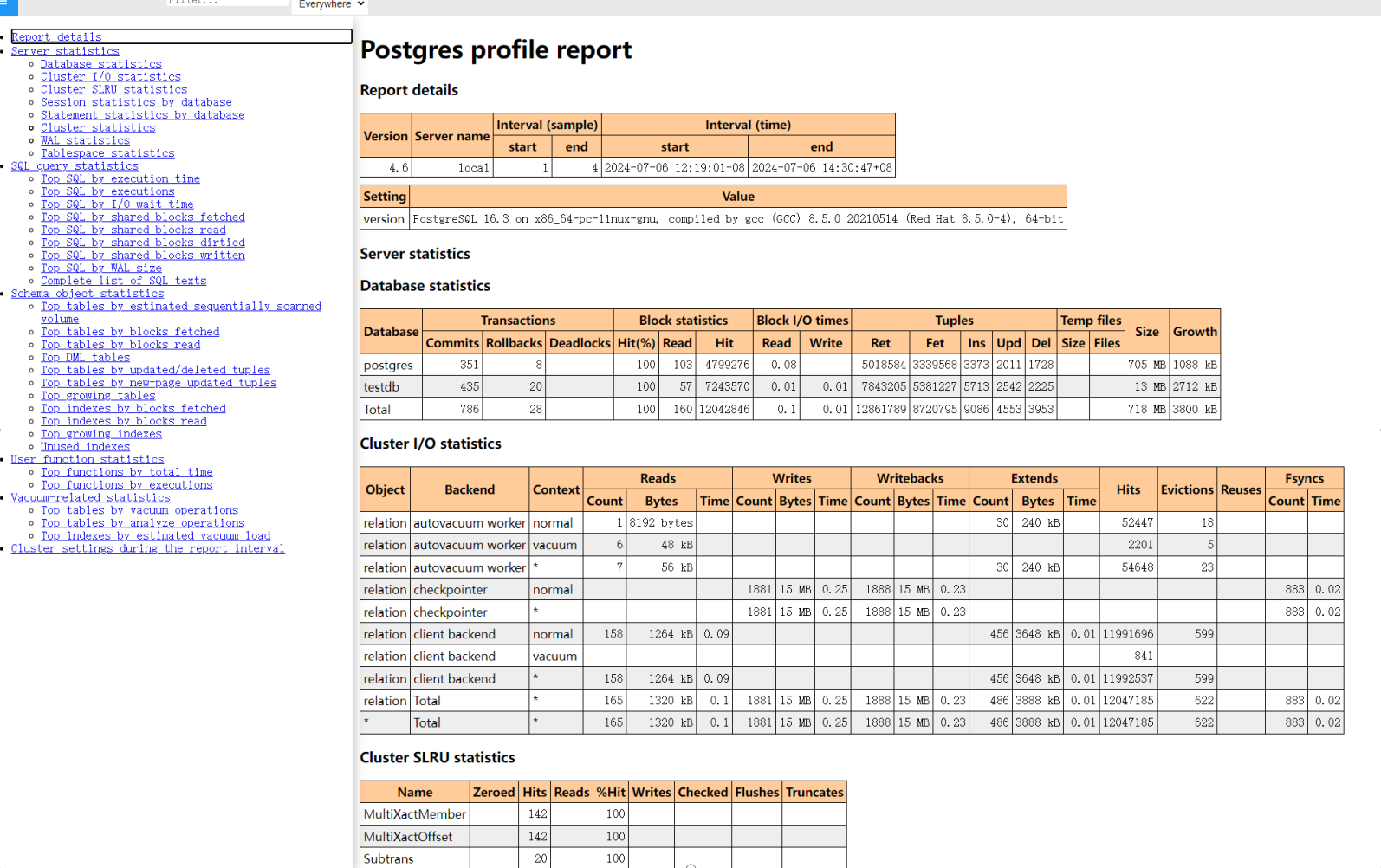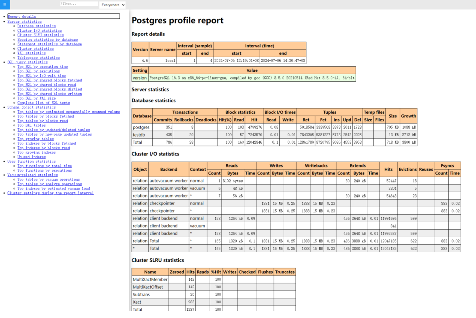 [postgres@Server ~]$ psql -dtestdb -Usy -Aqtc "select profile.get_report(tstzrange('2024-07-05 17:51:35+03','2024-07-07 15:52:18+03'))" -o /install/awr_report_range.html [postgres@Server ~]$