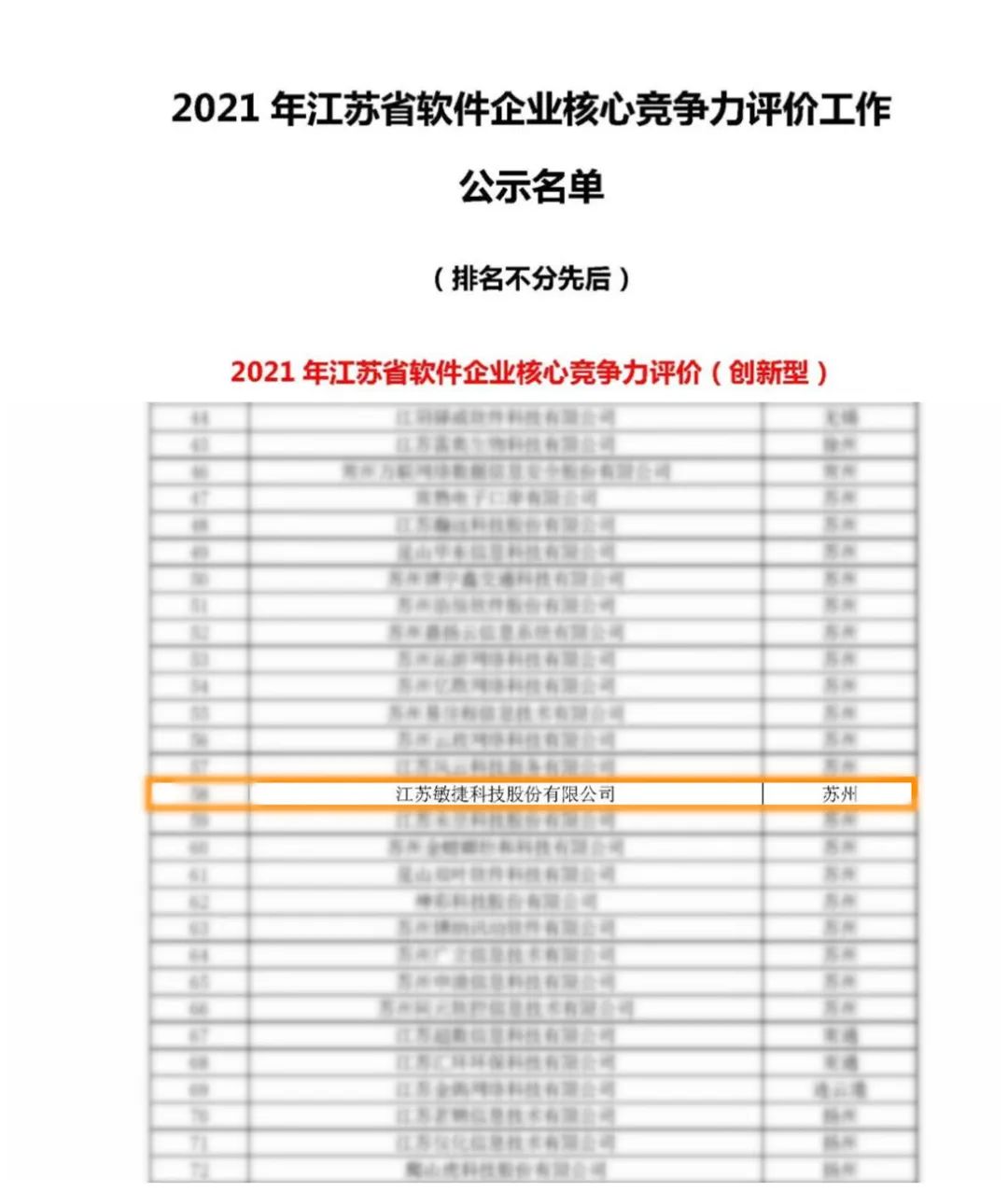 近日,江苏省软件行业协会对外正式公布了2021年江苏省软件企业核心竞争力评价结果。敏捷科技凭借多年在数据安全与数据管理领域的自主研发和持续创新,荣获「核心竞争力评价(创新型)企业」。