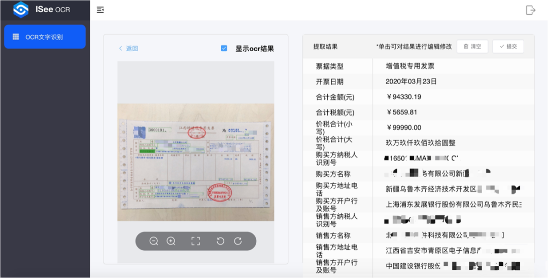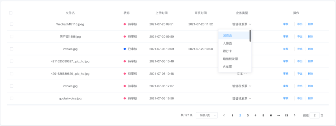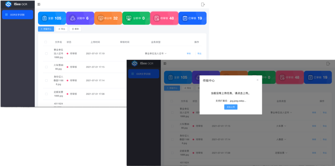 平台支持用户上传JPG、PNG、PDF、TIFF等图片类文档,ISeeOCR智能文字识别引擎将对文件进行存储和展示。用户可以对文件进行筛选,并对文件及识别结果进行审核、导出、删除等操作。