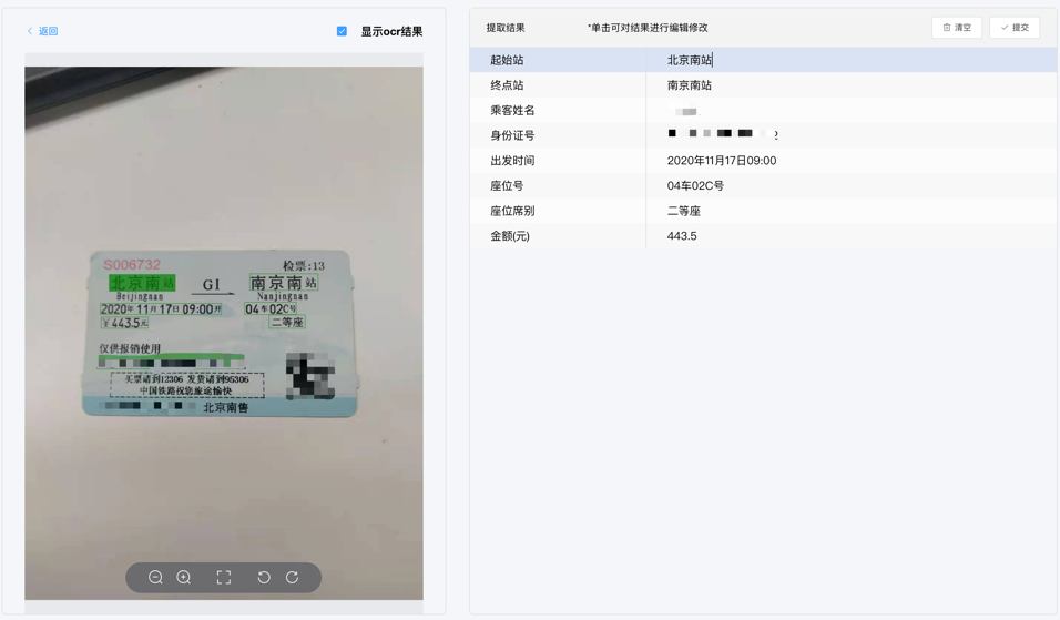 平台基于财税场景提供多种识别模板,实现对各类税务发票、交通票据等的自动识别和录入,应用于企业税务核算及内部报销等场景,实现财税报销的自动化。