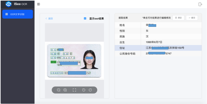 用户可以在平台中查看引擎识别结果,如文字在图片中的位置或文本的内容,也可以自行修改文本结果,并对结果进行保存、导出。
