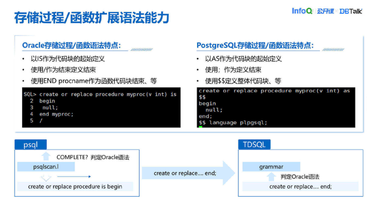 下面看一下我们在 PLSQL 里做的一些工作。Oracle 的一个存储过程是用 IS、begin、null、end myproc 这种语法创建的,它的基本特点就是以 IS 作为代码块的起始定义,用/作为结束定义,用 END procname 作为函数代码块结束,还有比如说它可以不用 declare,如果有变量也不用写 declare,等等。TDSQL 之前不是这样的语法特点,就像下面这个例子,它以 AS 作为代码块的起始定义,下面这个 create or replace as 作为定义,$$作为整体代码块定义,下面还有 language plpgsql,这些都不能少,再来一个分号作为定义结束。这样看它的语法结构,大的结构差别还是比较多的。做里的兼容不是说在数据库内核改一下内核代码就能支持的,因为它要在客户端工具做相应的支持。