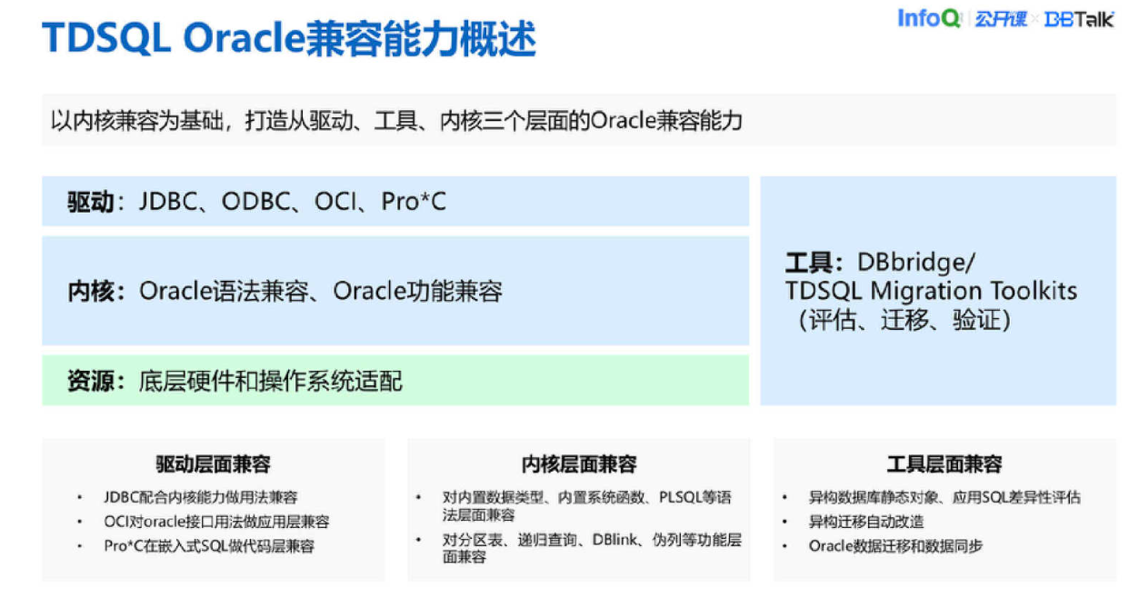 TDSQL 的 Oracle 兼容能力如上图所示,从宏观来看 TDSQL 针对 Oracle 兼容所做的事情就是这些。