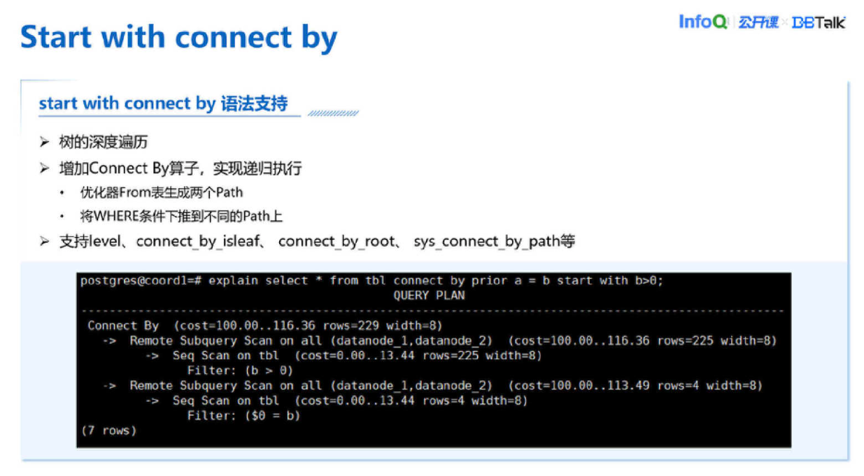 Start with connect by 就是层次查询,在 Oracle 这个层次查询执行后就是把整个数据按照一个树形的结构选择出来。它的执行办法是树的深度优先遍历,就像上图下面这个查询,Connect by A=B 其实就是通过 A=B 递归查询,对这个数进行深度优先遍历。我们在实现的时候增加了一个 Connect By 算子实现递归查询。优化器会对 From 表生成两个 Path,上面这个 Path 会输出这棵树的 Root,就是根元组;下面这个 Path 是一个递归 Path,通过根元组递归调用这个 Path 去把下层结果都输出来,递归算法都在 Connect By 算子里面实现。Oracle 有个比较特殊的地方,在 Connect By 的时候 WHERE 条件会有不同处理,比如 WHERE 里条件如果是涉及两个表,它会先于 Connect By 算子计算,就相当于 push 到 Connect By 下面去做,然后剩下的就可以作为过滤条件。我们支持伪列比较多,层次查询都支持,像 level、connect by is leaf、connect by root、sys connect by path 这些都是支持的;sys connect by path 是函数,它不是个伪列,用于把当前的从根到叶元组路径输出。
