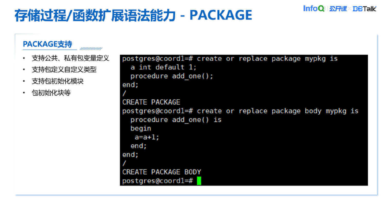 PACKAGE 就是一个变量和函数存储过程的集合,一个包一个集合,所以我们支持公共、私有包变量定义,可以在包里自定义类型,包里面的自定义类型可以用于函数定义、包外函数定义、包内函数定义。我们也可以支持包的初始化模块。第一次访问这个包的时候先初始化,然后把一些变量都初始化再去用。包也可以用在其他 PLSQL 对象里,比如说函数、存储过程都可以使用的。